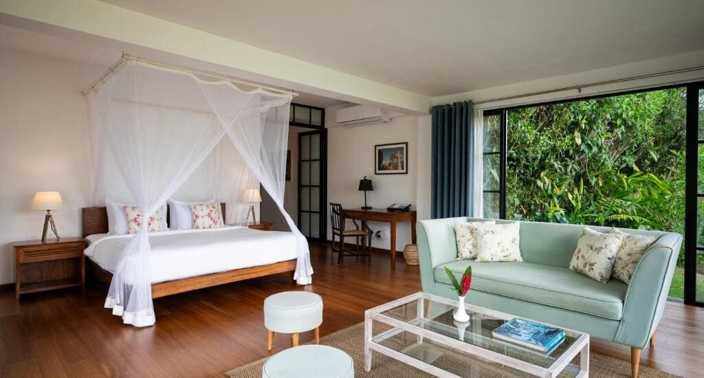 This colonial-style mansion offers five elegant suites, each with a private balcony overlooking the mountains and gardens. Rooms feature daily-replenished bottled water, tea and coffee facilities, daily housekeeping, evening turndown service, on-call butler service, and special arrangements or cakes for birthdays and anniversaries.